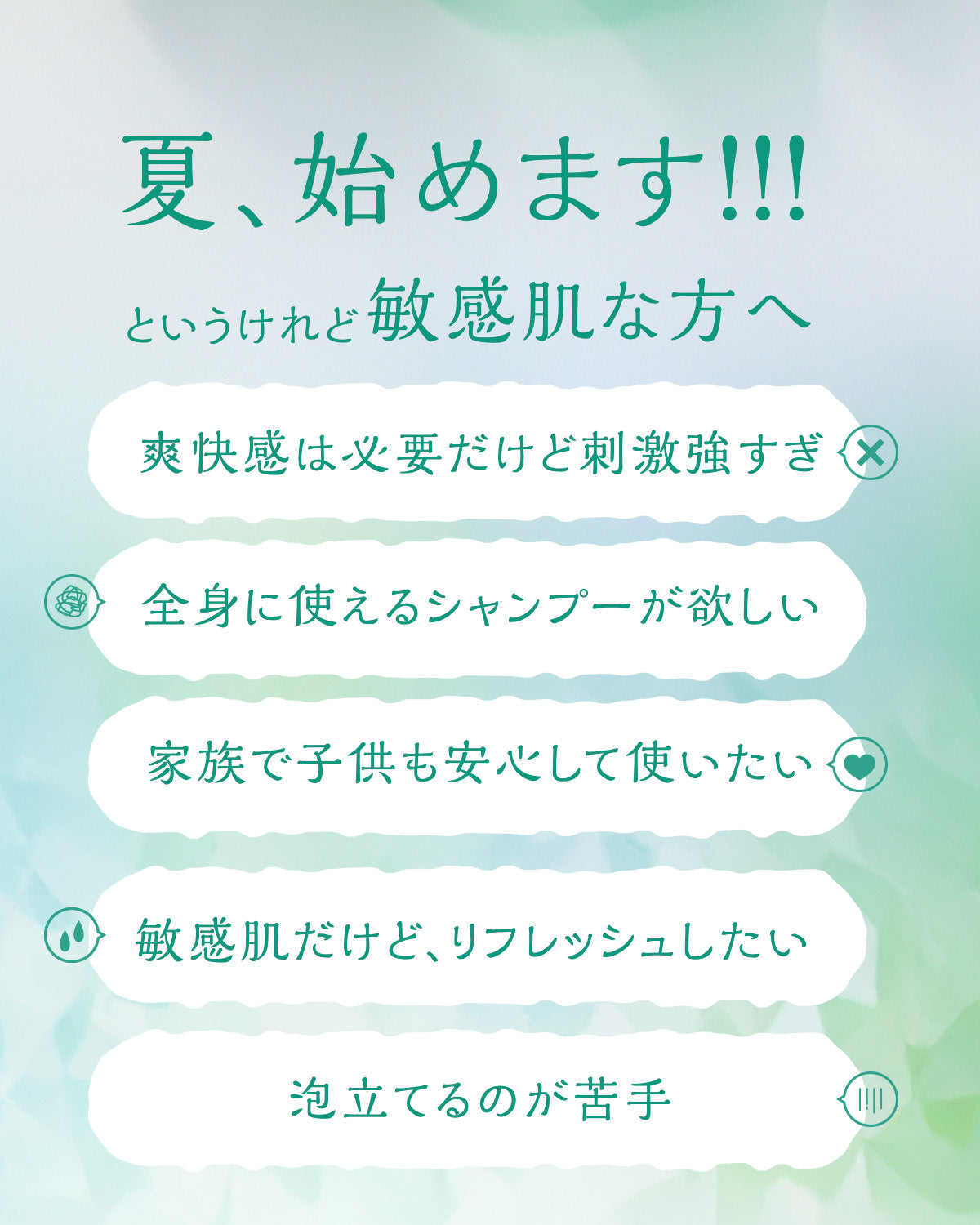 | 全成分 | 水 、ココイルグルタミン酸TEA、PG、グリセリン、コカミドプロピルベタイン、ラウロイルメチルアラニンNa、デシルグルコシド、ココイルリンゴアミノ酸Na、コカミドDEA、ヒアルロン酸Na、ヒアルロン酸ヒドロキシプロピルトリモニウム、リンゴ果実培養細胞エキス、グリチルリチン酸2K、グリコシルトレハロース、加水分解水添デンプン、ハッカ油、メントール、クレマティス葉エキス、スギナエキス、セイヨウキズタ葉/茎エキス、セイヨウナツユキソウ花エキス、ヒバマタエキス、キサンタンガム、レシチン、塩化Na、安息香酸Na、ペンテト酸5Na、BG、フェノキシエタノール、メチルパラベン、メチルイソチアゾリノン、香料 |