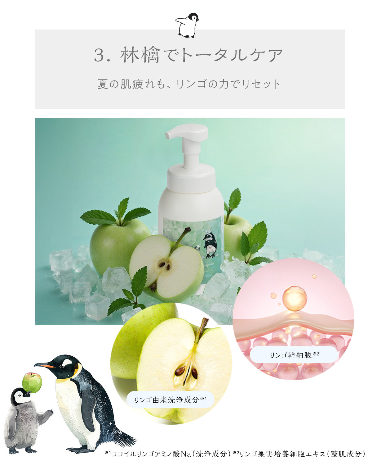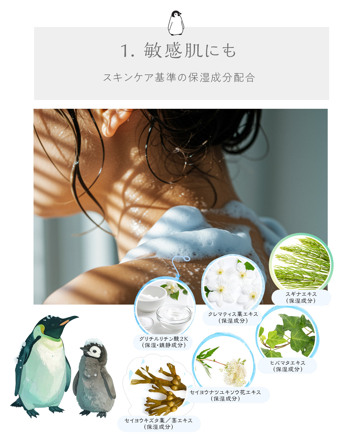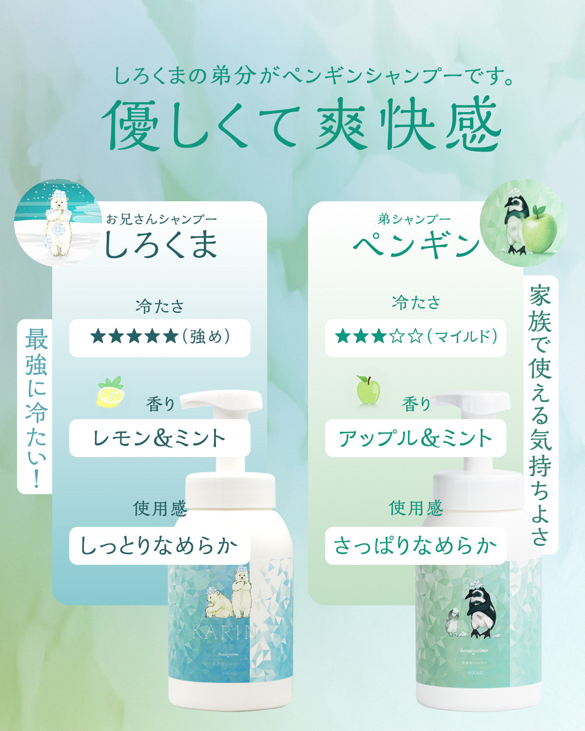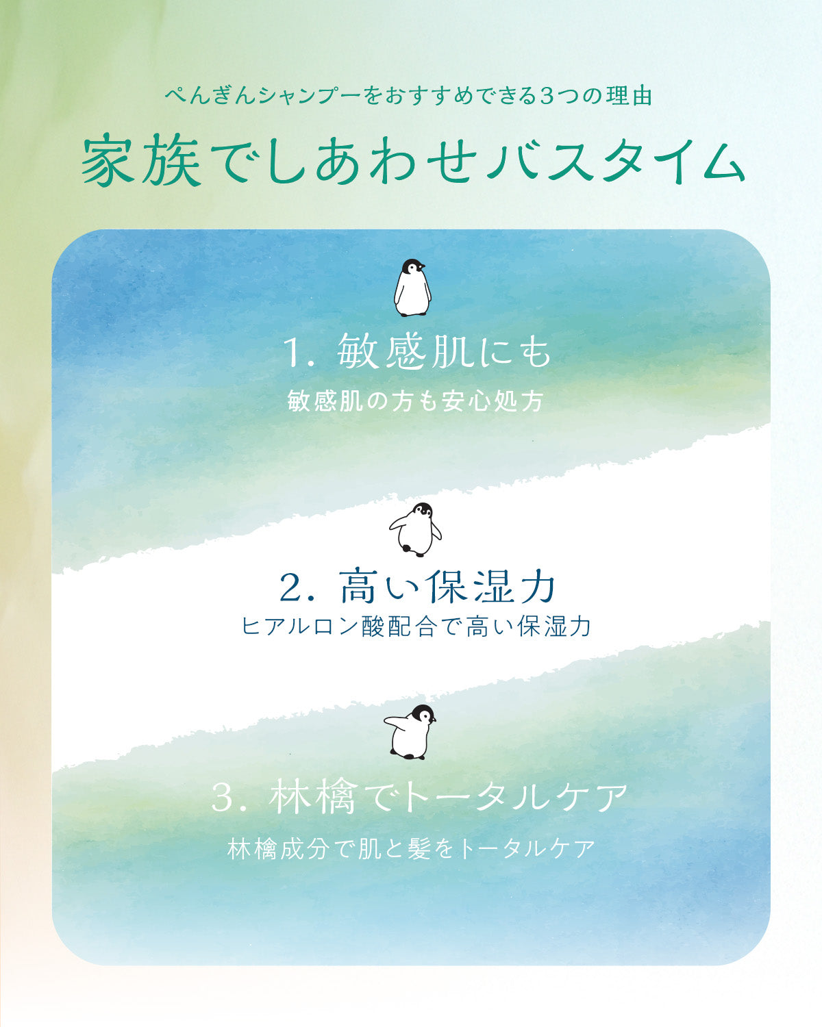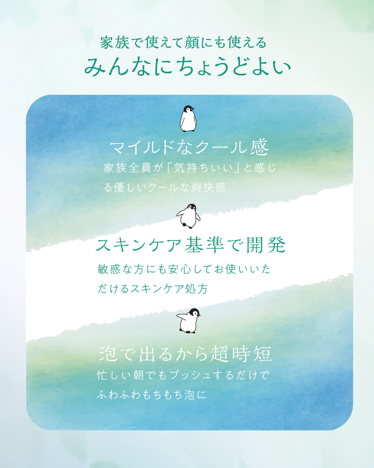 ペンギンもひんやり!?家族で使える全身泡シャンプー 爽快な洗い心地の、全身に使える泡タイプのアミノ酸系洗浄料です。 |
