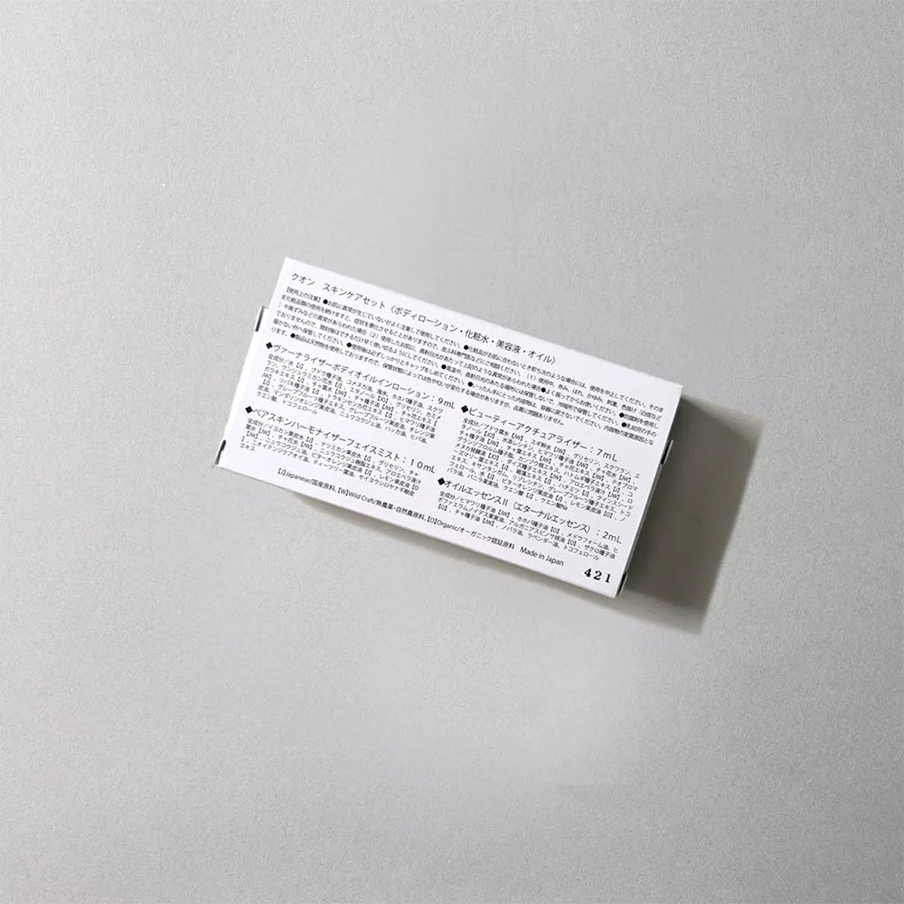 QUONの人気アイテムを一度に体験できるトライアルセット 自然栽培で育てられた大和茶をキー成分としたQUONの定番アイテムをセットにし、スキンケアからボディケアまでトータルでお試しいただけます。 ■QUONの基本ケアをラインで体験 化粧水・美容液・オイル・ボディケアまで、人気の4アイテムをバランスよくセット。 初めての方でも、QUONの世界観と使い心地をしっかりご体感いただけます。 ■自然由来の恵みを感じるスキンケア 農薬や肥料に頼らず育てられた大和茶をはじめ、植物由来成分を使用。 毎日のケアを心地よいひとときへと導きます。 ■こんな方におすすめ ・QUONを初めてお使いになる方 ・ライン使いを試してみたい方 ・スキンケアからボディケアまでまとめて試したい方 ■基本のご使用ステップ 洗顔後、フェイスミストをなじませた後、セラムを使用します。 その後、オイルエッセンスで肌を整え、乾燥が気になる部分にはオイルインローションをご使用ください。 【使用の目安】 開封後はできるだけ早めに使い切ってください。 |