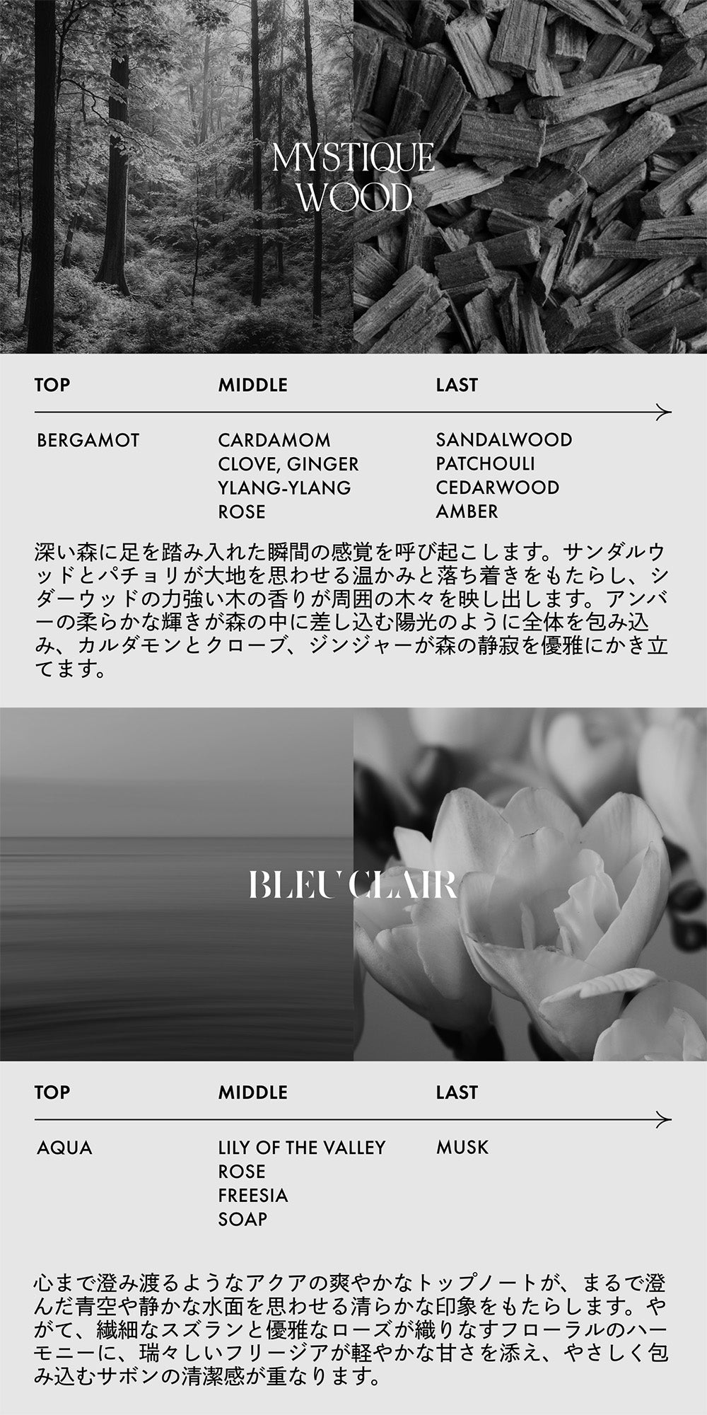 | 香り | BLANCHE ブランシュ / Neroli Smoke tea ネロリスモークティー / MYSTIQUE WOOD ミスティックウッド / BLEU CLAIR ブルークレール / Pair BLANCHE ペアーブランシュ |